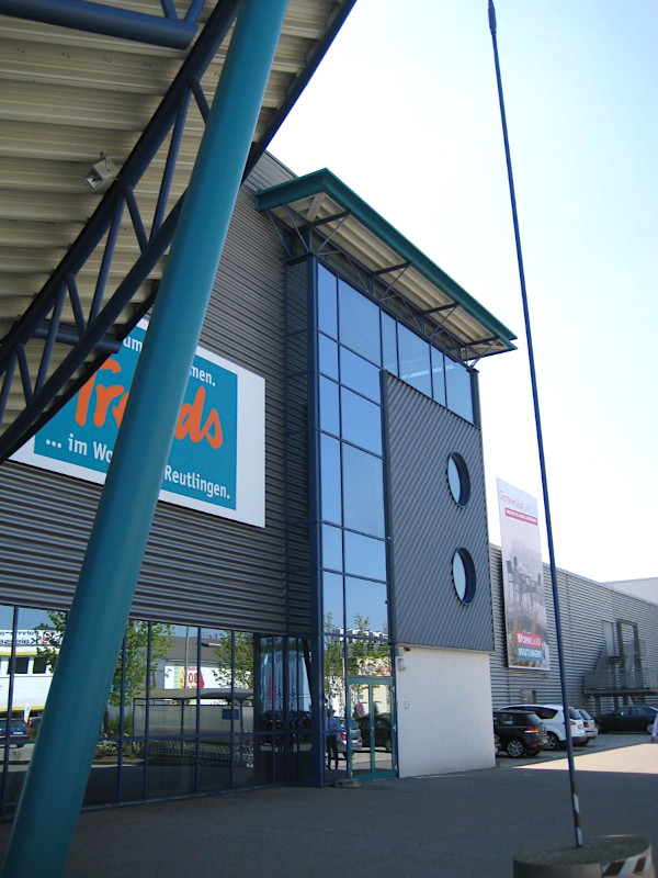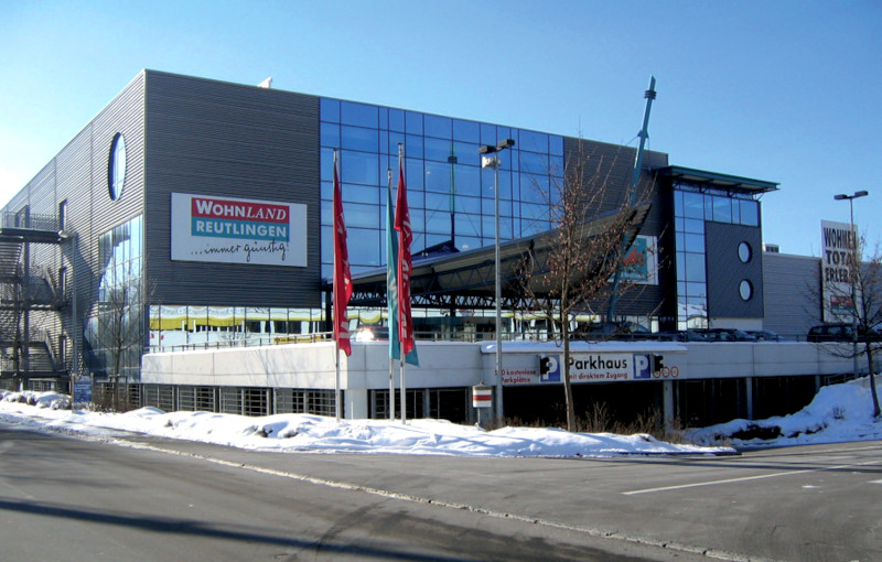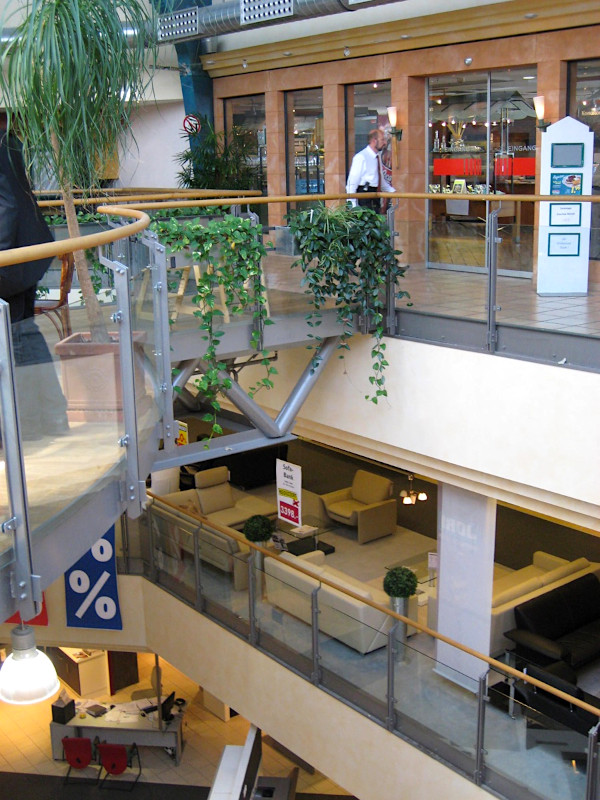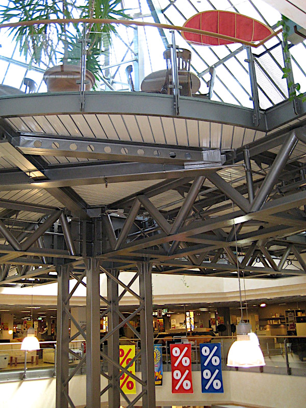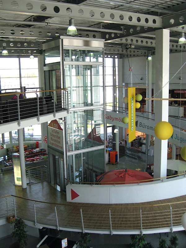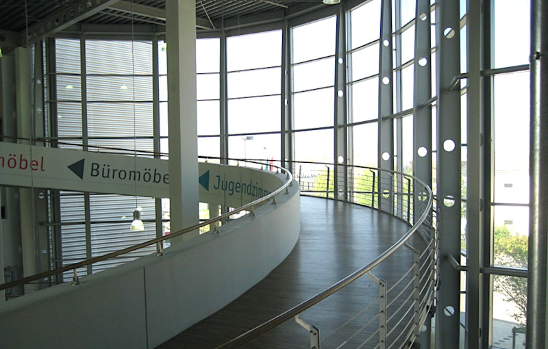 Das von schairer + partner architektur geplante und realisierte Verbindungsgebäude dient als zentraler Erschließungspunkt zwischen dem bestehenden Möbelhaus und dem neuen Mitnahmemarkt. Die Anbindung sämtlicher zu Galerien ausgebauten Geschosse erfolgt über eine auf vier Stützen gelagerte frei auskragende Betonspindel und einen Glasaufzug. Sämtliche Geschosse beider Gebäudeteile sind von der Spindel aus einsehbar.