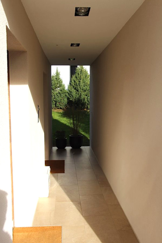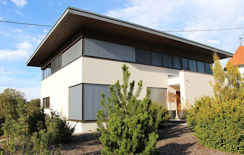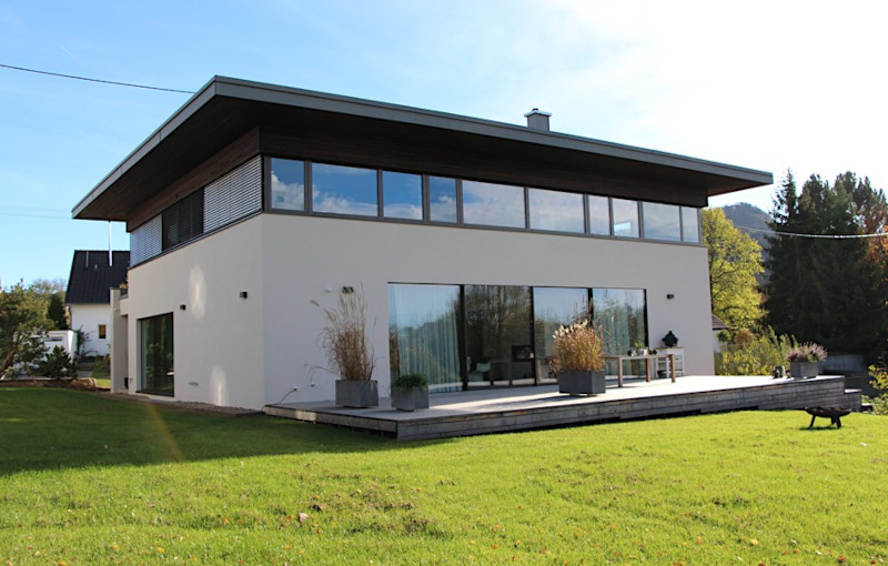 Das Haus präsentiert sich in einem klaren, minimalistischen Design mit einer eleganten, geometrischen Architektur. Dieses exklusive zweigeschossige Wohnhaus vereint zeitlose Eleganz mit moderner Funktionalität. Die klare Linienführung, die reduzierte Formensprache und die großzügigen Glasflächen in beiden Geschossen schaffen ein harmonisches Zusammenspiel von Licht, Raum und Natur. Im Erdgeschoss öffnet sich das Gebäude zu einer großzügigen Holzterrasse, die den Übergang zum Garten darstellt und so die harmonische Verbindung von Architektur und Natur unterstreicht. Das Obergeschoss ist ringsum verglast und bietet durch die Überdachung großzügigen Schutz für die darunterliegende Fassade. Die klare Linienführung, die offenen Räume und die Integration in die Umgebung verleihen dem Haus eine ruhige, zeitgemäße Eleganz – ideal für ein stilvolles Leben im Grünen.